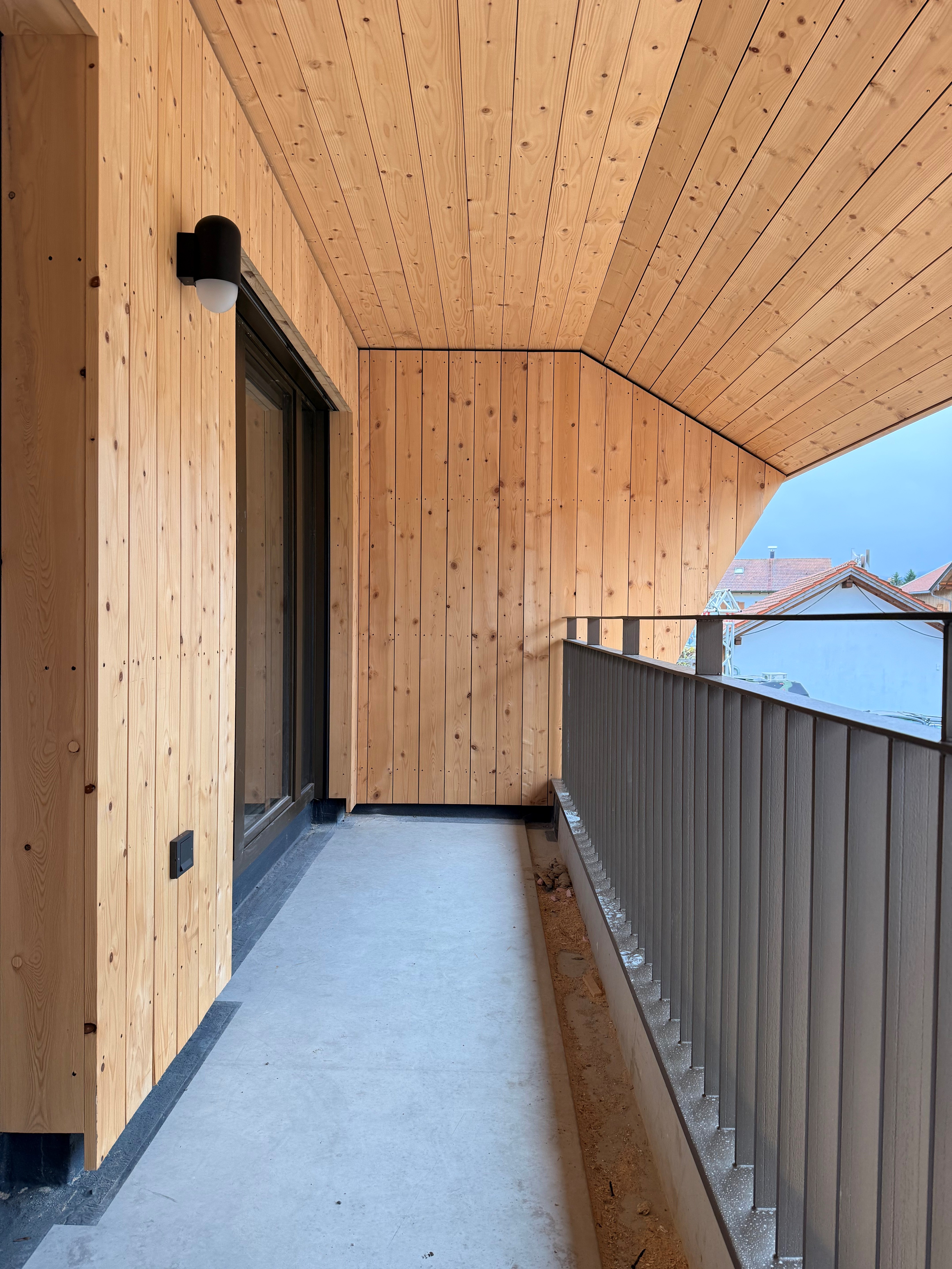 Auch im Mehrfamilienhaus zeigt sich ein deutlicher Fortschritt. Der Estrich wurde verlegt, und die Fliesenlegerarbeiten haben begonnen. Gleichzeitig führt der Zimmerer die Holzverschalung an der Fassade aus, wodurch das Gebäude bereits seinen charakteristischen Look erhält.